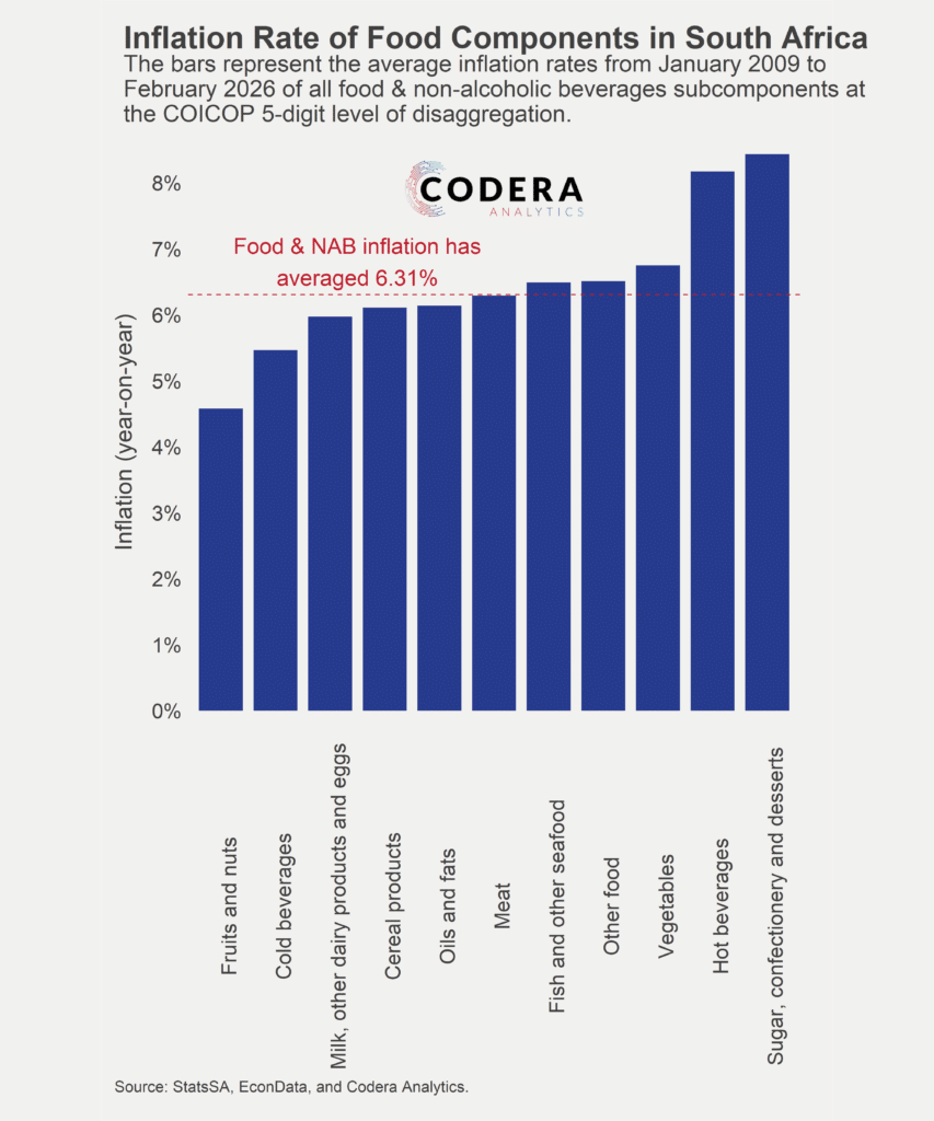 The Reserve Bank’s latest projections also assume that food inflation in South Africa will shift structurally lower following the reduction in the inflation target. But food inflation in South Africa has historically been much higher than the new target. Since January 2009, food inflation has averaged 6.3% – much higher than the 3% the Bank assumes over its projection period. Recent farmgate price data suggest that many food categories, particularly meat, will continue to experience increases at much faster rates than the inflation target, particularly as fertiliser and transport costs spike. Early indications are also that labour unions will continue to push for wage increases that far exceed the new target.