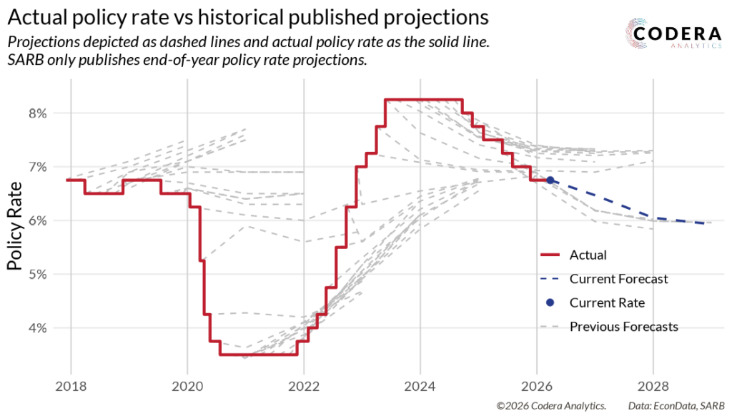 Oil price spikes and exchange rate volatility mean that there is a significant transport cost increase heading our way. Our modelling suggests that over the long term, headline inflation rises by 0.3 percentage points in response to a 10% increase in the US dollar price of oil. However, when oil price increases are accompanied by a weaker exchange rate or other supply chain disruptions, the ultimate impact on inflation tends to be higher still. Since the exchange rate depreciated sharply in March, we forecast that inflation will rise to over 4.5% this year and continue rising to over 5% by early 2027. Should the oil price increase further and the rand depreciate, inflation will rise even more.