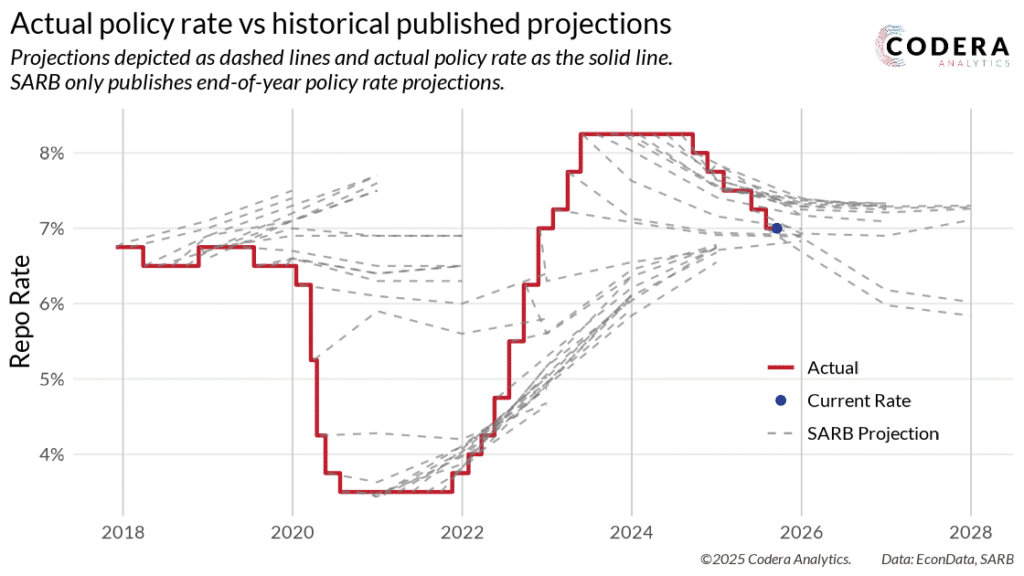 The good news is that inflation expectations are continuing to decline. But, as we have shown in our research, inflation perceptions take a long time to adjust. When SARB announced a preference for 4.5% in 2017, it took around four years for inflation expectations to converge on the lower target.