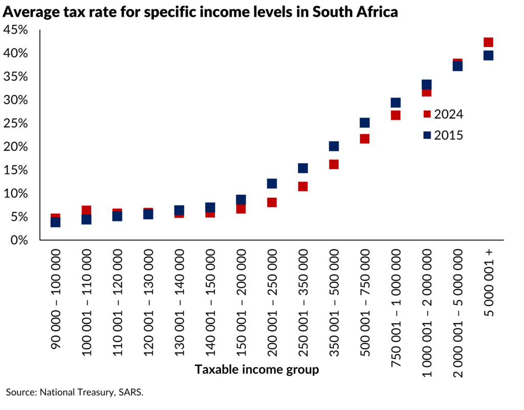 South Africa’s tax system is highly progressive, with tax rates increasing as taxable income rises. Since 2015, average tax rates have declined for incomes between R140,000 and R2 million, while rates for incomes below R100 000 and exceeding R2 million have risen. Although up-to-date global comparisons of average tax rates are not readily available, South Africa’s personal tax rates remain relatively high by international standards.