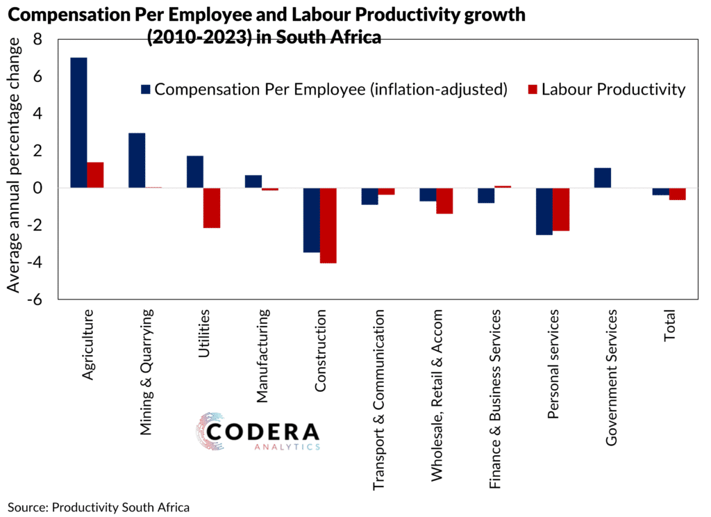 Productivity South Africa estimates show that only the Agricultural sector has experienced meaningfully positive labour productivity growth since 2010. It has also been the industry that has experienced the fastest average wage growth by these estimates (see here for a comparison to estimates from Statistics South Africa). Note that there are large differences between these labour productivity estimates and those from other sources (see here) and these average wage estimates and those from other data sources,in part reflecting definitional and coverage differences (see here and here).