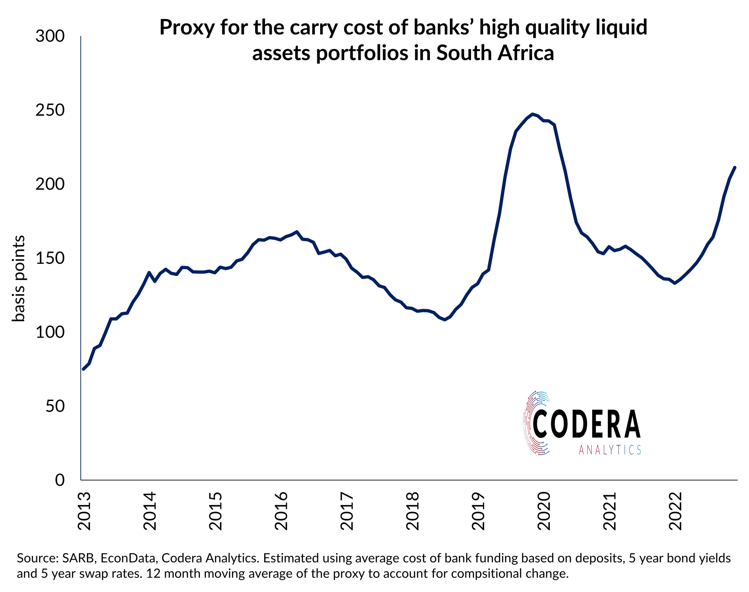 In today’s post, we use data on bank funding in South Africa to create a proxy of bank funding costs and the carry cost of banks’ high quality liquid asset (HQLA) portfolios. The proxy is calculated using long bond yields as a proxy for the unhedged yield on HQLA, as well as swap rates under the assumption that banks hedge their HQLA holdings, and our measure of average bank funding costs, expressed as a spread to a money market reference rate (taken as 3 month JIBAR). We take the 12 month moving average of the proxy to account for gradual compositional change.