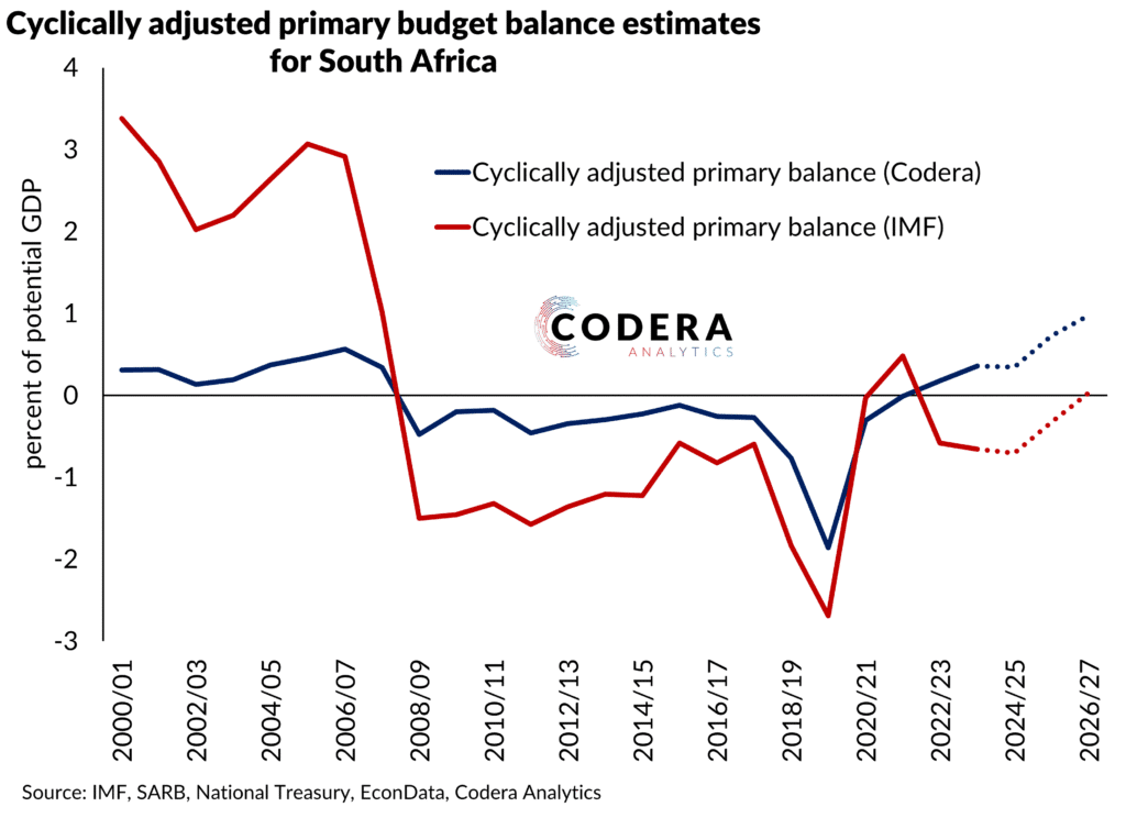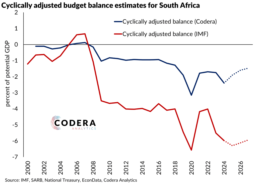 Today’s post by Jurgens Fourie compares Codera’s estimates of South Africa’s cyclically adjusted budget balance to those of the IMF. These estimates provide a clearer picture of a government’s underlying fiscal position by removing the temporary effects of the business cycle. Both sets of estimates show that South Africa has been running structural fiscal deficits between the global financial crisis and the pandemic. This suggests underlying fiscal imbalances were not merely temporary and that policy adjustments would have been needed to ensure long-term sustainability. The differences in these estimates owe to different assumptions about potential output and fiscal elasticities.