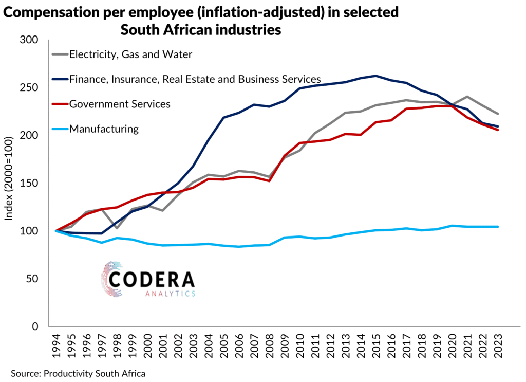Productivity South Africa estimates suggest that wages have growth rapidly since 2010 in Electricity, water and gas (‘Utilities’), and the Finance and Government sectors.