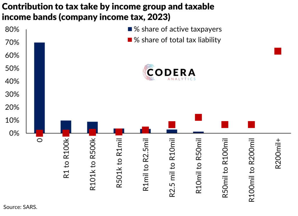Companies earning over R200 million in taxable income (around 550 companies) contributed almost 65% of the total company tax take in South Africa in 2023. Around 70% of companies did not earn positive taxable income in 2023. These figures vary a lot year to year: you can see earlier years’ estimates herehere and here.