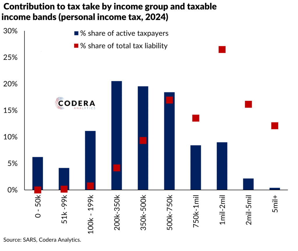 Taxpayers earning over R2 million per year in taxable income account for only 2% of taxpayers but contribute almost 30% of the total personal income tax take in South Africa. Those earning below R350k represented over 40% of taxpayers in 2024 but contributed only around 5% of personal income tax revenues.