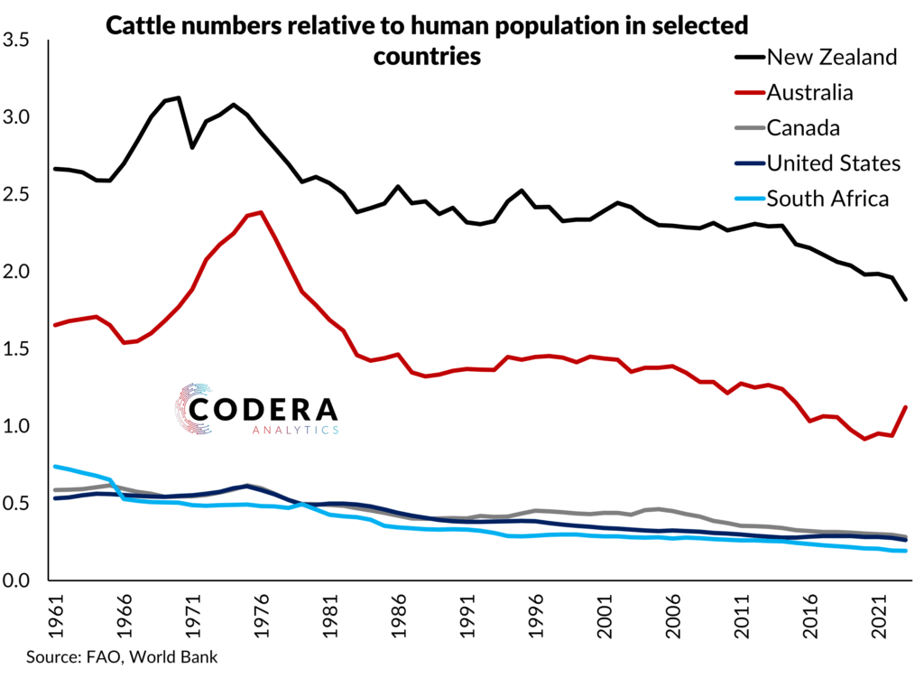 The cattle to human ratio rose in the late 1960s in New Zealand and Australia and have declined slightly since then. As we showed in an earlier post, in part this reflects an increase in agricultural productivity, with the size of cows rising steadily.