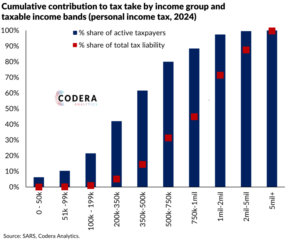 South Africa has a progressive tax system, with those earning less than 200 thousand rand a year representing over 20 percent of taxpayers, contributing less than 1% of total personal income tax collections. People earning over 1 million rand a year, on the other hand, contributed almost 55% of the total personal income tax take, but only represent 11% of taxpayers.
