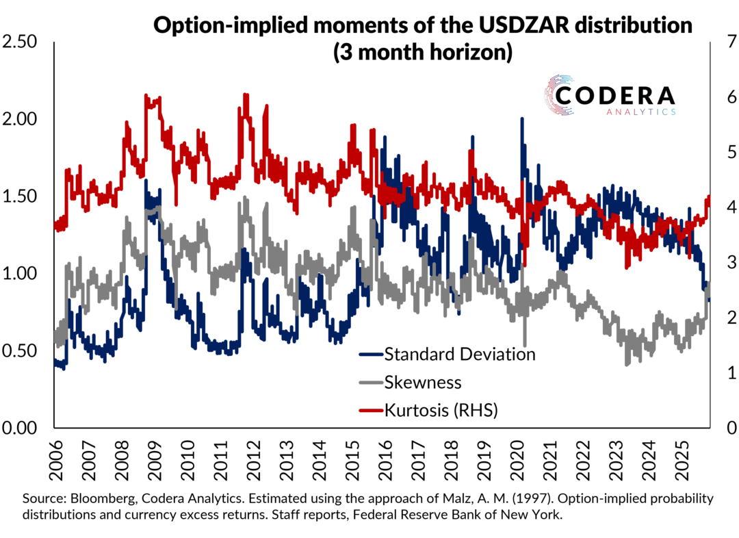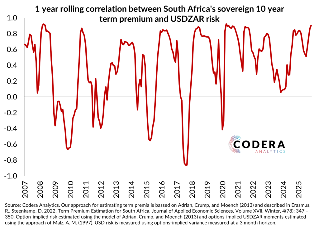 One possible explanation for South Africa’s steep sovereign yield curve is that elevated exchange rate depreciation risk has been embedded in our long term interest rates. Today’s post updates analysis from our paper on SA’s yield curve conundrum. Options-implied variance, which captures exchange rate uncertainty priced into FX options prices, has historically had a strong, but time-varying relationship with the South African term premium. This suggests that high historical South African sovereign long term rates could partly reflect investors concerns about the possibility that the rand could depreciate strongly, which would be expected to push up inflation. Since the beginning of the year, the correlation has strengthened, as uncertainty about the outlook for the USDZAR has fallen as the the term premium has fallen.