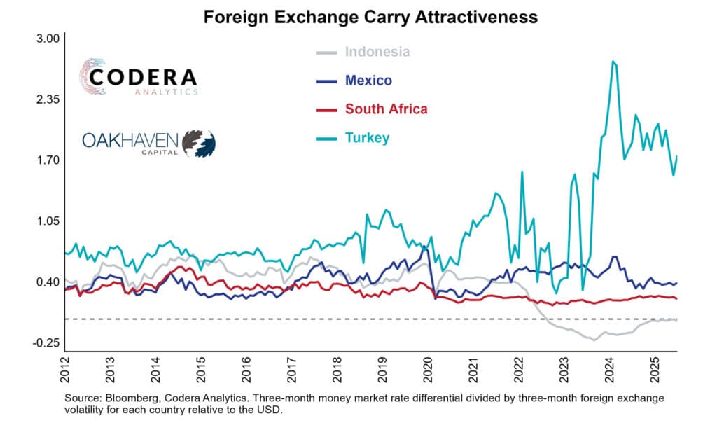 The rand has delivered lower carry returns among major emerging market currencies such as the Turkish lira—where high interest rates have been overwhelmed by steep depreciation— or Mexican peso.