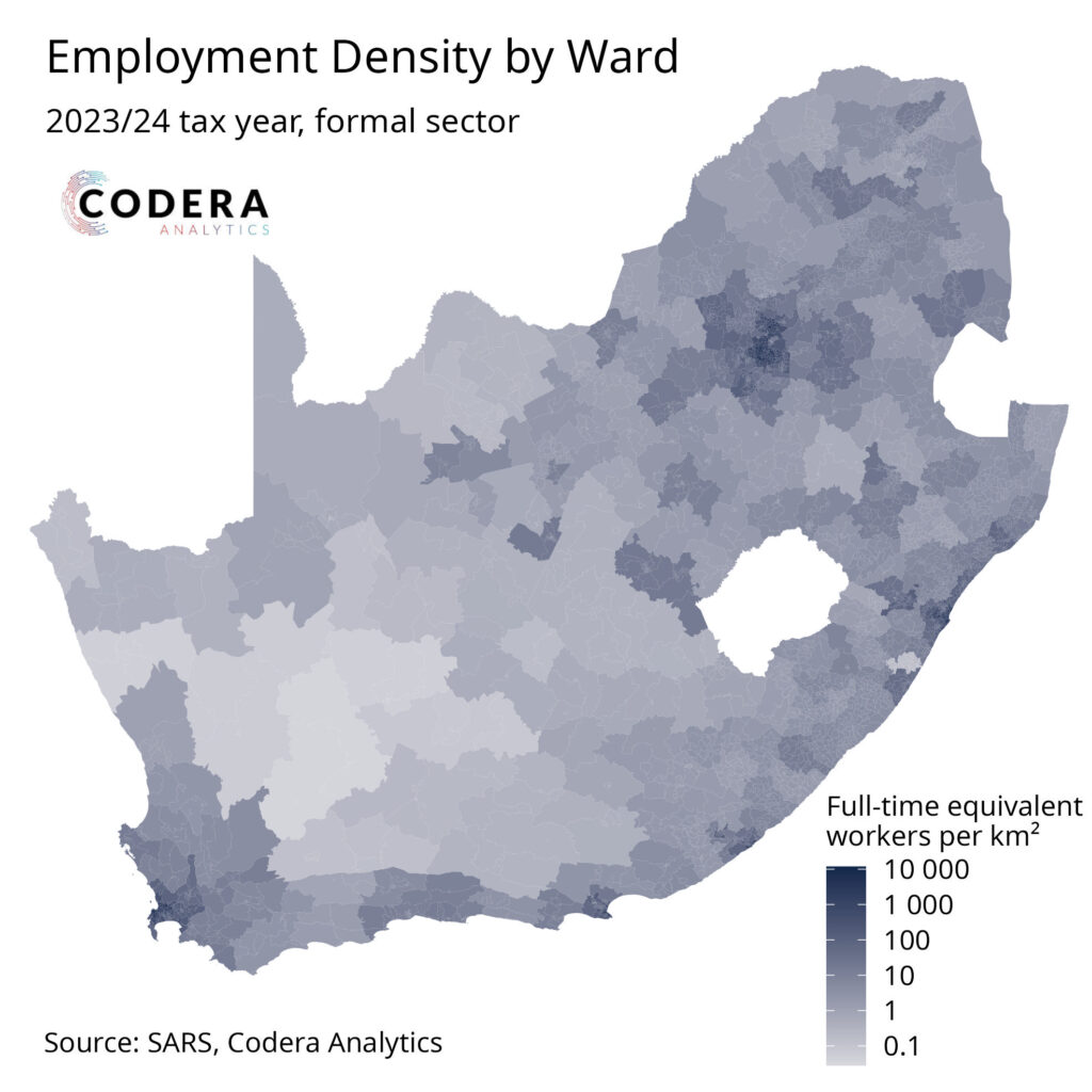 Today’s post by Aidan Horn shows that employment is concentrated in Cape Town (with a maximum density of 11 700 workers per km² in ward 115 (the city centre, excluding Bo-Kaap)), followed by Johannesburg (reaching up to 7500 workers per km² in ward 123 (where Hillbrow and the University of Johannesburg is)). Codera has launched a spatial data module that makes the SARS Spatial Tax Panel easily accessible for free on EconData.