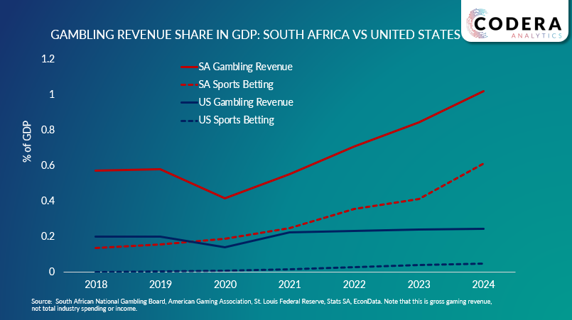 The South African gambling industry has grown dramatically since the COVID-19 pandemic. Gross gambling revenues are also much larger in South Africa relative to the size of our economy.