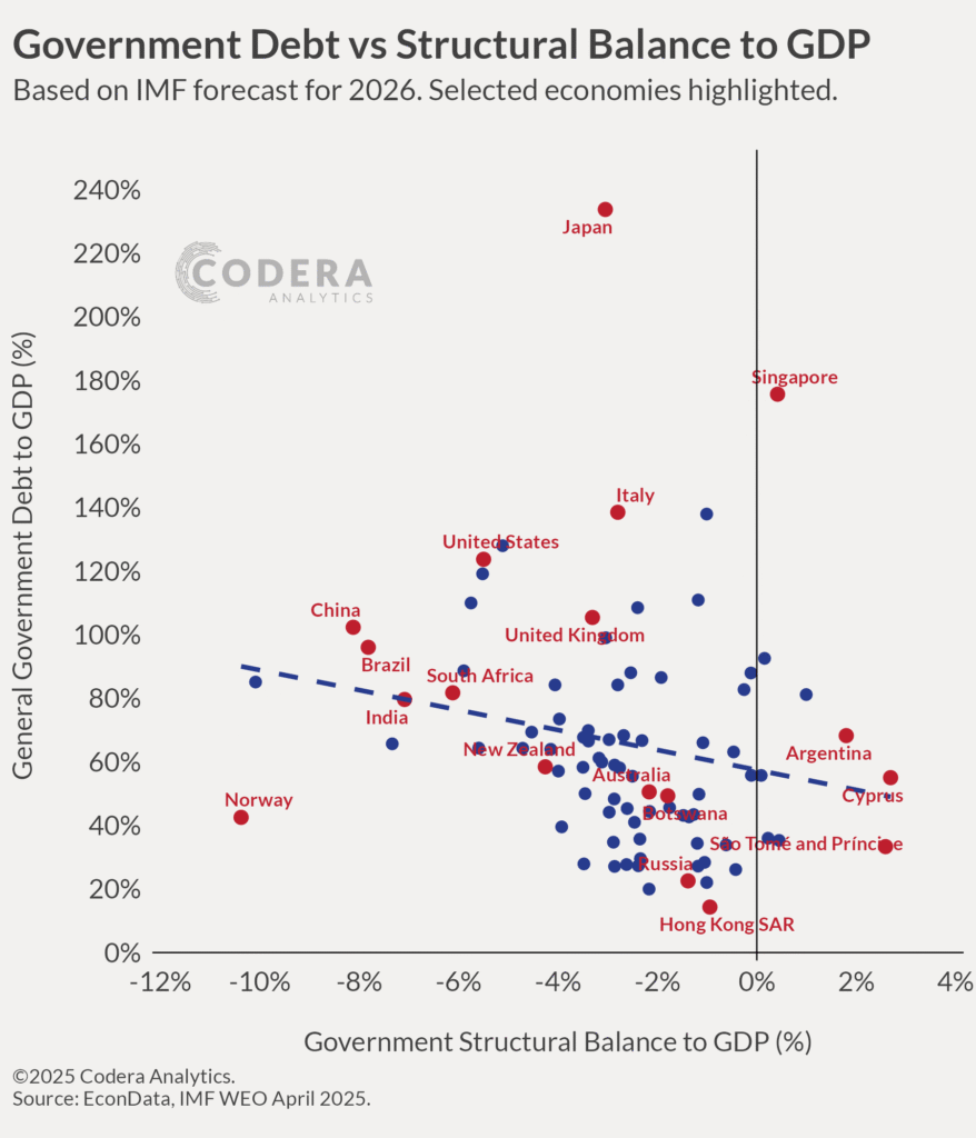 Government debt-to-GDP ratios and IMF structural balance estimates reveal stark contrasts across major economies, with South Africa, the United States, and China standing out for their unique fiscal profiles. Today’s post by Jan Hendrik Pretorius shows that like countries such as the U.S. and China, South Africa carries relatively high debt with one of the most negative structural balances among emerging markets, highlighting significant fiscal strain.