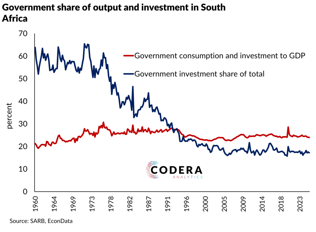 The share of government investment in SA has fallen substantially over recent decades. However, the size of government, as measured by government’s contribution to consumption has risen strongly over the same period.