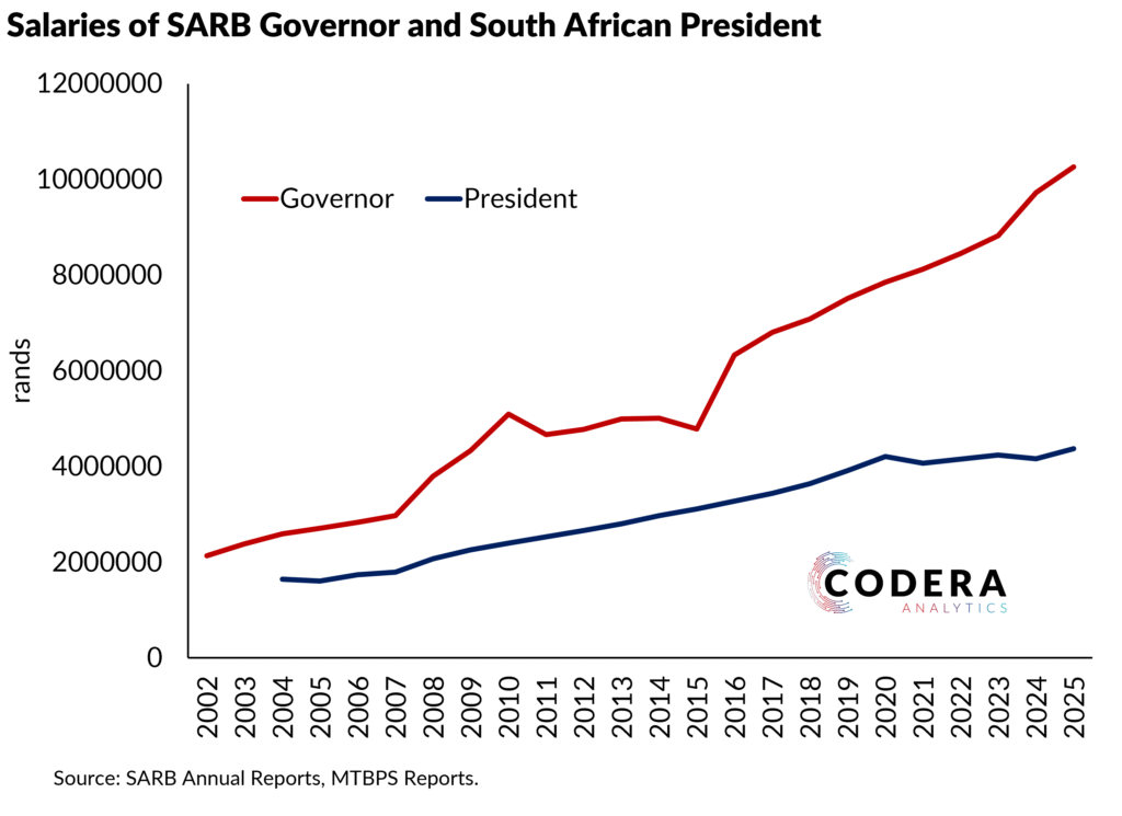 The remuneration for the position of SARB Governor has risen much faster than for that of the President, growing at a compound annual average of 7.1% compared to 5.0% since 2004. Over the last year, the Governor’s total pay package rose by 5.6% compared to 2.7% in consumer price inflation (CPI) in 2024/25 (10.2% vs 5.9% CPI previous year). The SARB governor’s salary is similar to that of the governor of the Reserve Bank of New Zealand in common currency terms.