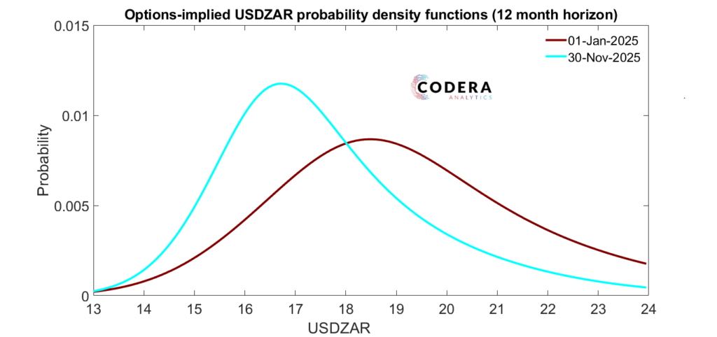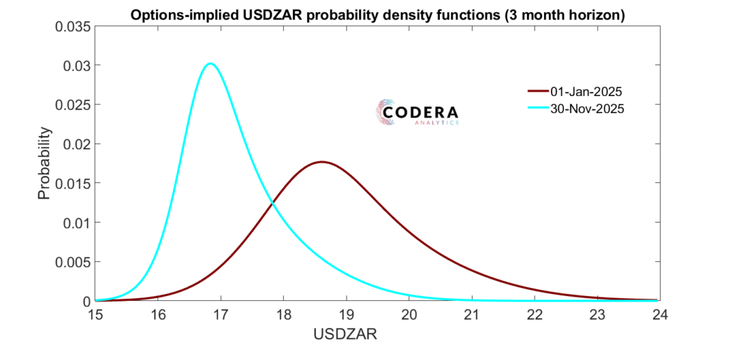 In today’s post, we back out market expectations of future USDZAR movements using options prices. The distribution of the USDZAR’s options-implied density has become more peaked, with more of the distribution’s probability mass at lower exchange rate levels as uncertainty around the mean expected value of USDZAR has decreased, particularly over a shorter horizon. As is typical for the rand, the market continues to price in a larger probability that the currency could depreciate than appreciate, visible as a rightward skew in the distribution. These figures show that the market is pricing lower ZAR uncertainty overall and lower risk that the rand could appreciate than at the beginning of the year (here and here).