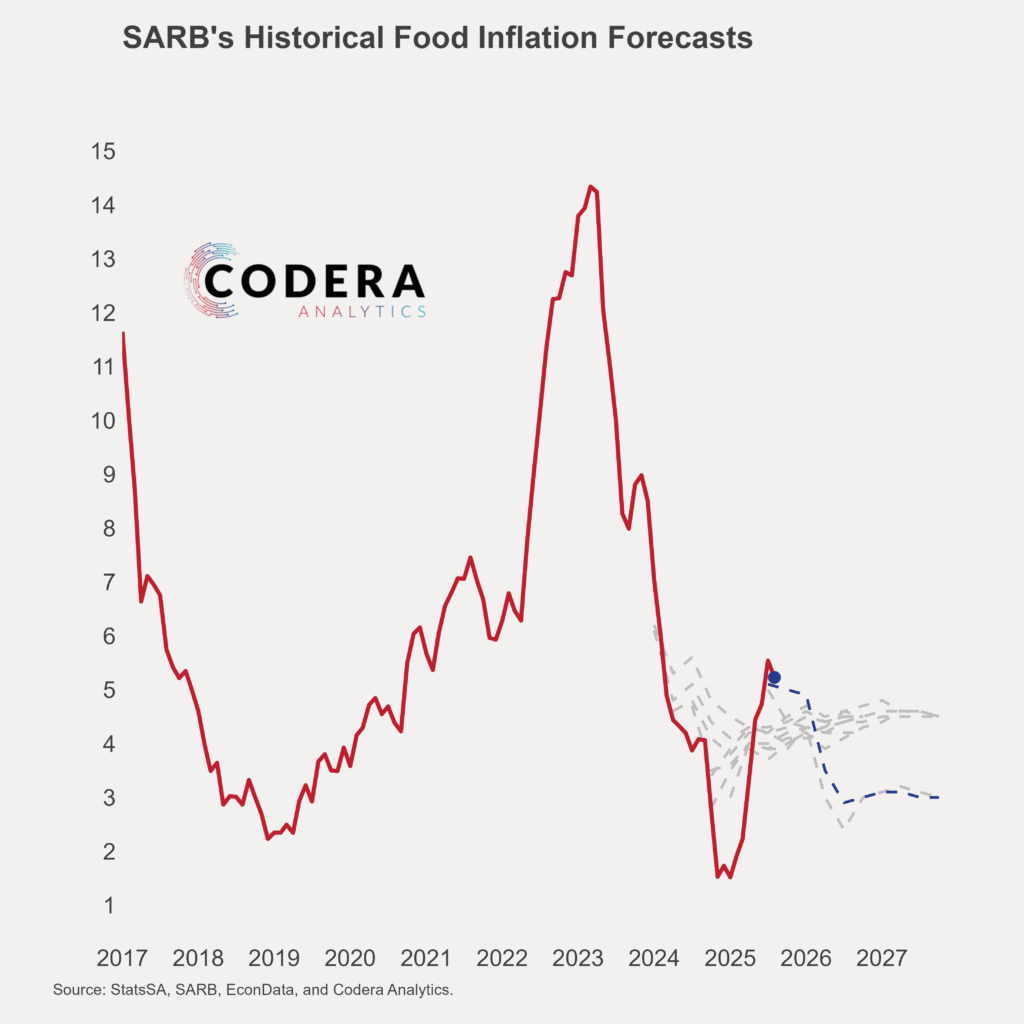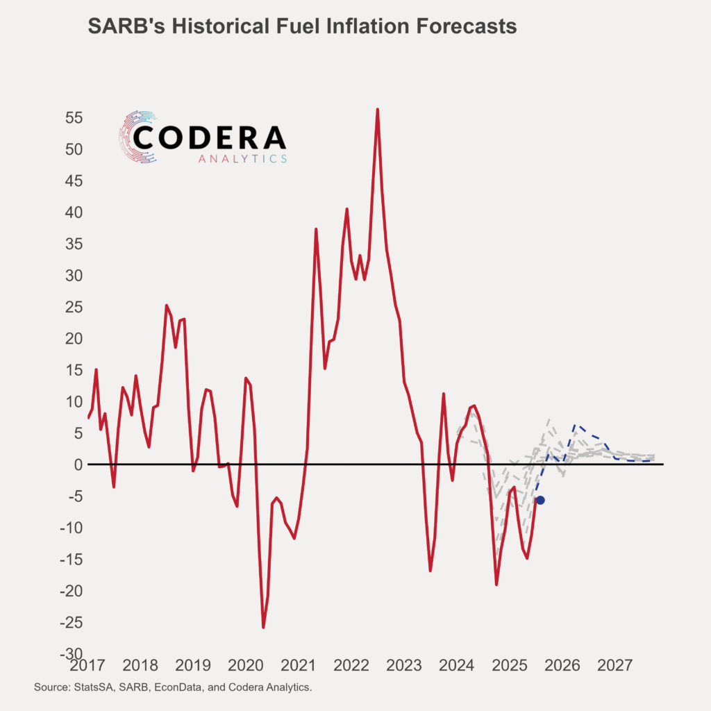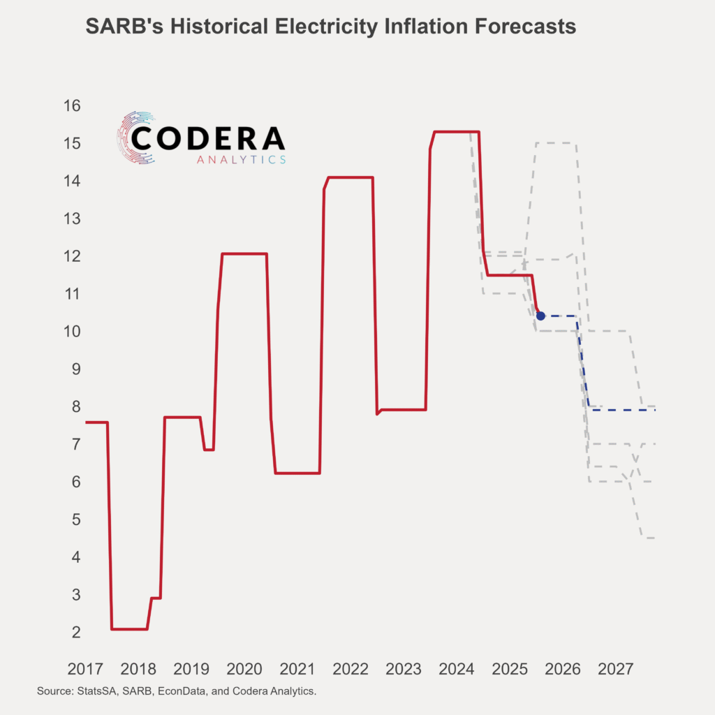 We showed in an earlier set of posts that SARB over-estimated headline inflation ahead of the COVID-19 pandemic, and under-estimated inflation in the aftermath of the pandemic. Over recent months, inflation came in lower than SARB’s forecasts. Today’s post by Oliver Guest shows SARB’s historical forecasts for electricity price inflation, food price inflation, and fuel inflation.
