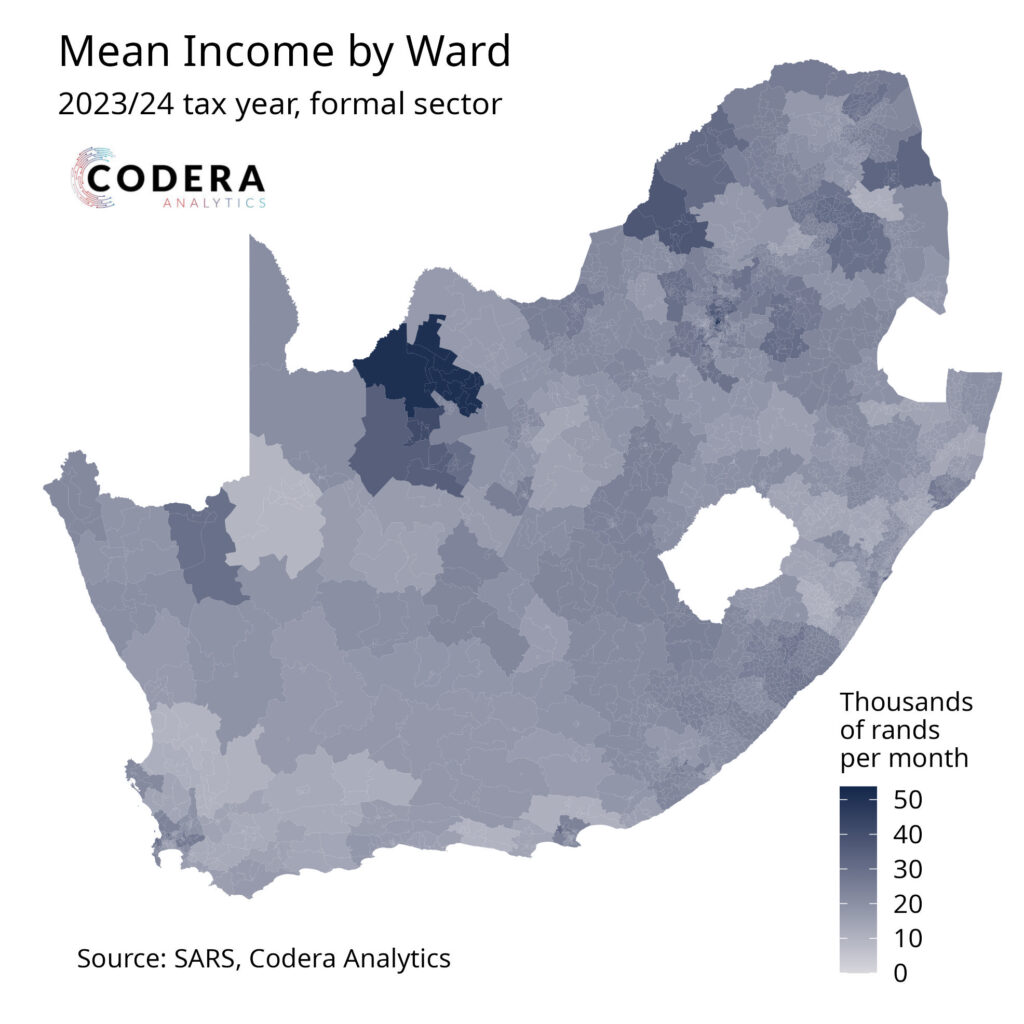 Today’s post by Aidan Horn plots mean formal sector income by ward in SA. Codera Analytics has launched a spatial data module that makes the SARS Spatial Tax Panel easily accessible for free on EconData, see the user guide here.