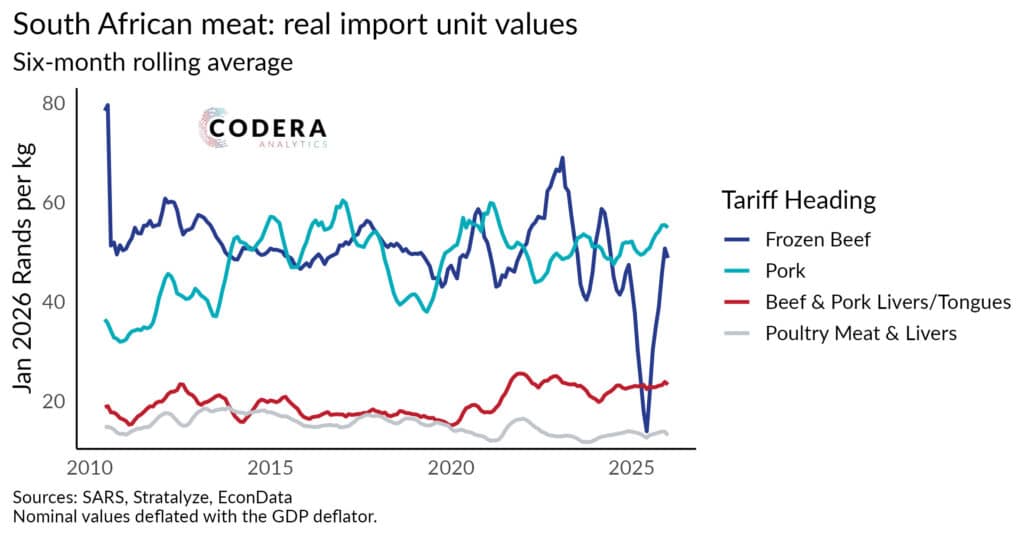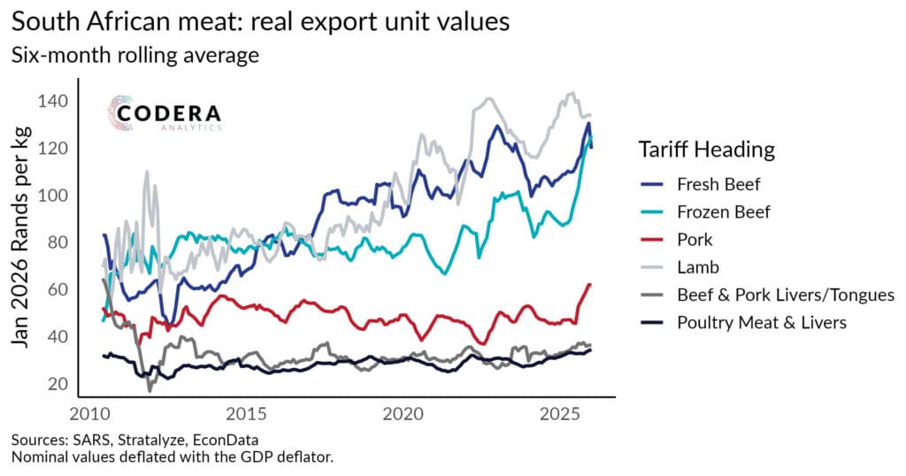 Today’s post by Aidan Horn shows that fresh beef, frozen beef and lamb export prices have risen strongly over recent months relative to history when adjusted for inflation. Import prices for meat have been much more stable relative to history on an inflation adjusted basis.