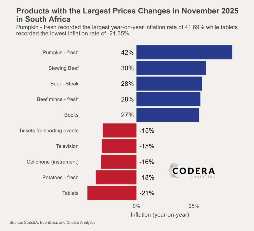 Today’s post by Oliver Guest shows that food prices for pumpkin and beef and book prices where the fastest growing components of the official; consumer price inflation index in South Africa. The biggest falls in prices were for sporting event tickets, televisions, tablets and cellphones, as well as potatoes.