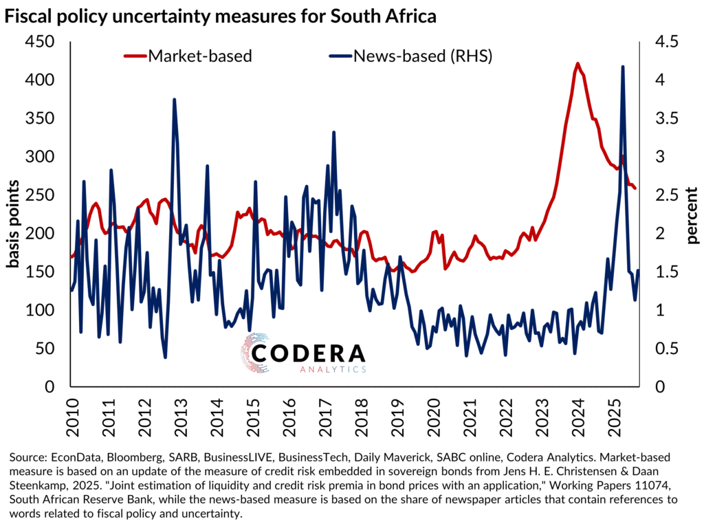 Today’s post with Jacques Quass De Vos compares two other market- and news-based fiscal policy uncertainty measures for South Africa from Codera. Fiscal policy uncertainty has been getting more news coverage over the last year but market-based measures of fiscal risk (a specific type of fiscal uncertainty) spiked a lot earlier. As we have shown, the recent spike in the South African fiscal credit risk premium seems tied to the increase in the South African government debt-to-GDP ratio. This higher perceived level of credit risk also seems to have influenced investors’ perceptions about the future liquidity in the South African government bond market, causing them to demand notably higher liquidity risk premia.