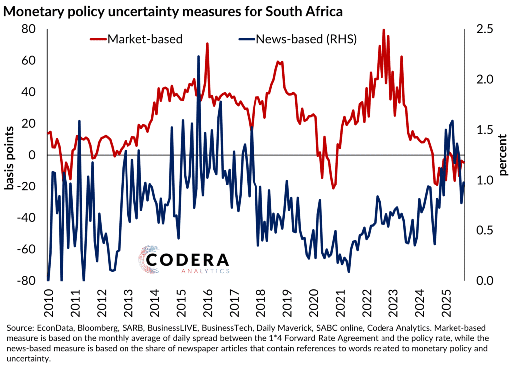 Ahead of today’s release of the October MPR, today’s post with Jacques Quass De Vos compares two other market- and news-based monetary policy uncertainty measures for South Africa from Codera. Monetary policy uncertainty has been getting more news coverage over the last 18 month. But there has been less divergence between market pricing and the policy rate over recent history. On the other hand, we have showed in an earlier post that there has been a little more dissent among members of the Monetary Policy Committee in 2025 compared with the average since 2015, which is another simple measure of subjective monetary policy uncertainty.
