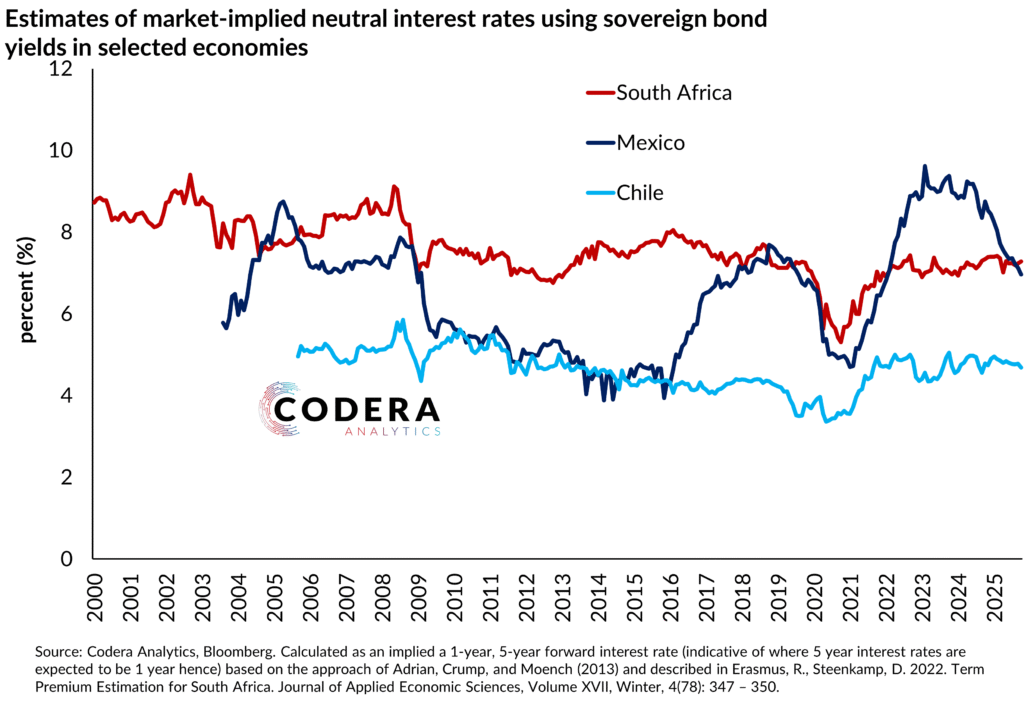 SARB argues that a lower target implies that monetary policy has shifted to a mildly restrictive stance. SARB’s current neutral estimate is 2.8% for 2025 after adjusting for inflation (5.8% nominal assuming a 3% inflation target or slightly above 6% if inflation expectations are assumed to be partly backward-looking). This implies tight policy as the current 7% policy rate is above that level. Today’s post presents a commonly-used measure of the market-implied neutral rate, showing that it is closer to 7%, similar to the level in Mexico, where the inflation target is 3%.