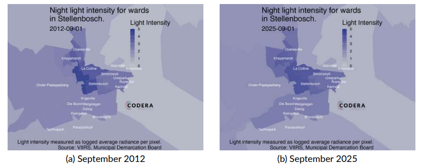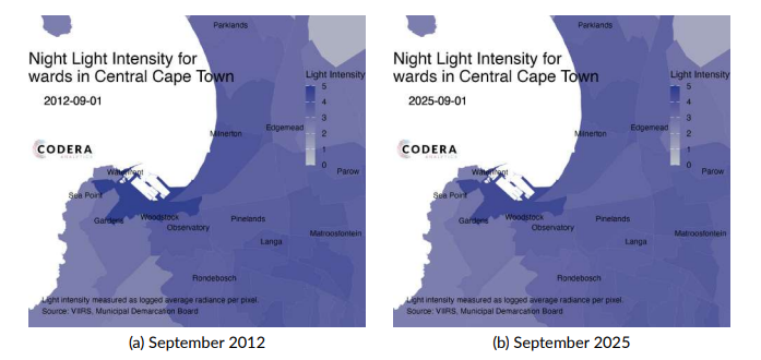 Today’s plot by Tristan Hoyle shows how night light has changed in Stellenbosch. Despite significant population growth and informal settlement development since 2012, there has been little noticeable increases in night light intensity. Read our new Policy Paper on changes in night lights in South Africa for more.