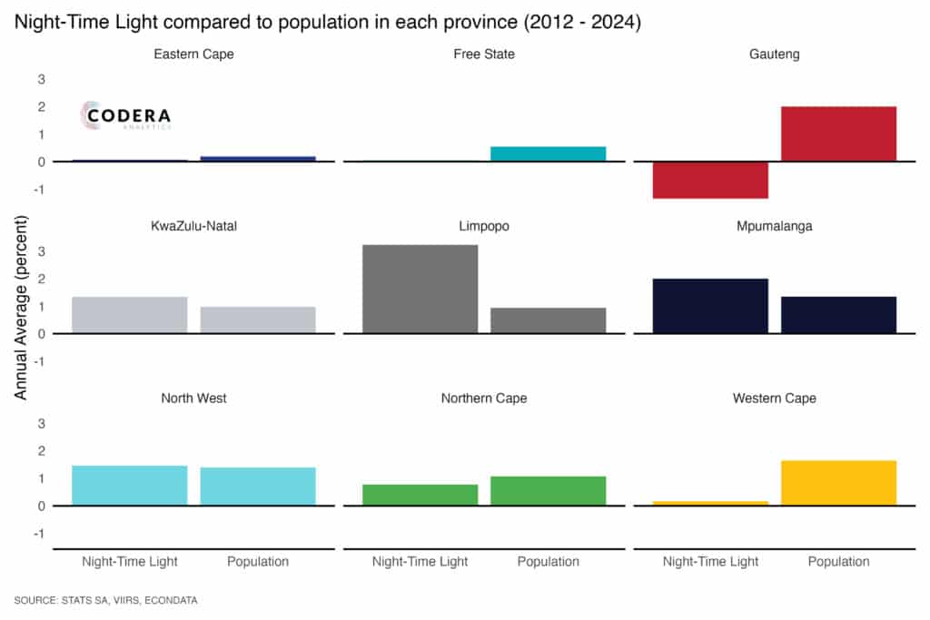 increase in its population. In the Western Cape, night lights have been largely flat despite a strongly increase in its population. The strongest increase in night light was in Limpopo province, which has experienced a significant increase in informal settlement formation. As we show in our recent Codera Policy Brief, satellite data sheds light on the implications of the collapse of state service delivery and South Africa’s decline in GDP per capita over the last decade.