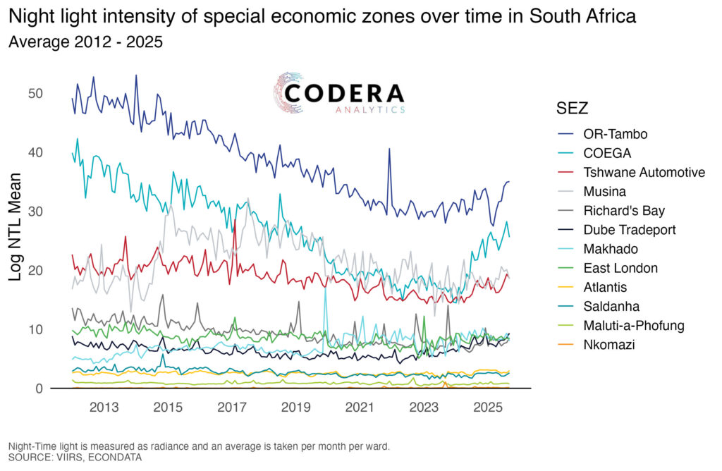 Today’s plot by Tristan Hoyle assess the change in night lights for selected special economic zones that have been designated areas offering tax and industrial incentives to promote industrialisation. Many of these areas have seen a large decline in night light intensity.