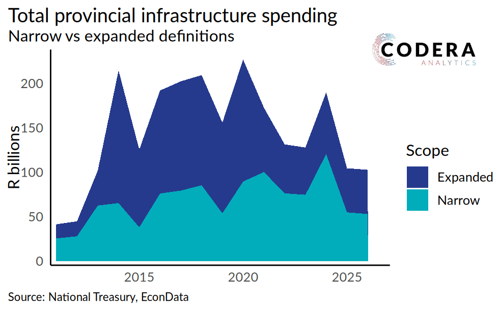 EconData delivers unique, ready-to-use datasets that work seamlessly in Excel, R, or Python. Its Provincial Budget submodule, for instance, gives researchers access to millions of rows of historical data to power in-depth public finance analysis. The chart below by Aidan Horn draws on this dataset to track total provincial infrastructure spending in South Africa, highlighting a sharp decline over the past five years—particularly under the expanded definition of infrastructure—and a flat outlook going forward (see here for details on the groupings). Get in touch if you’d like a demo of EconData in action.
