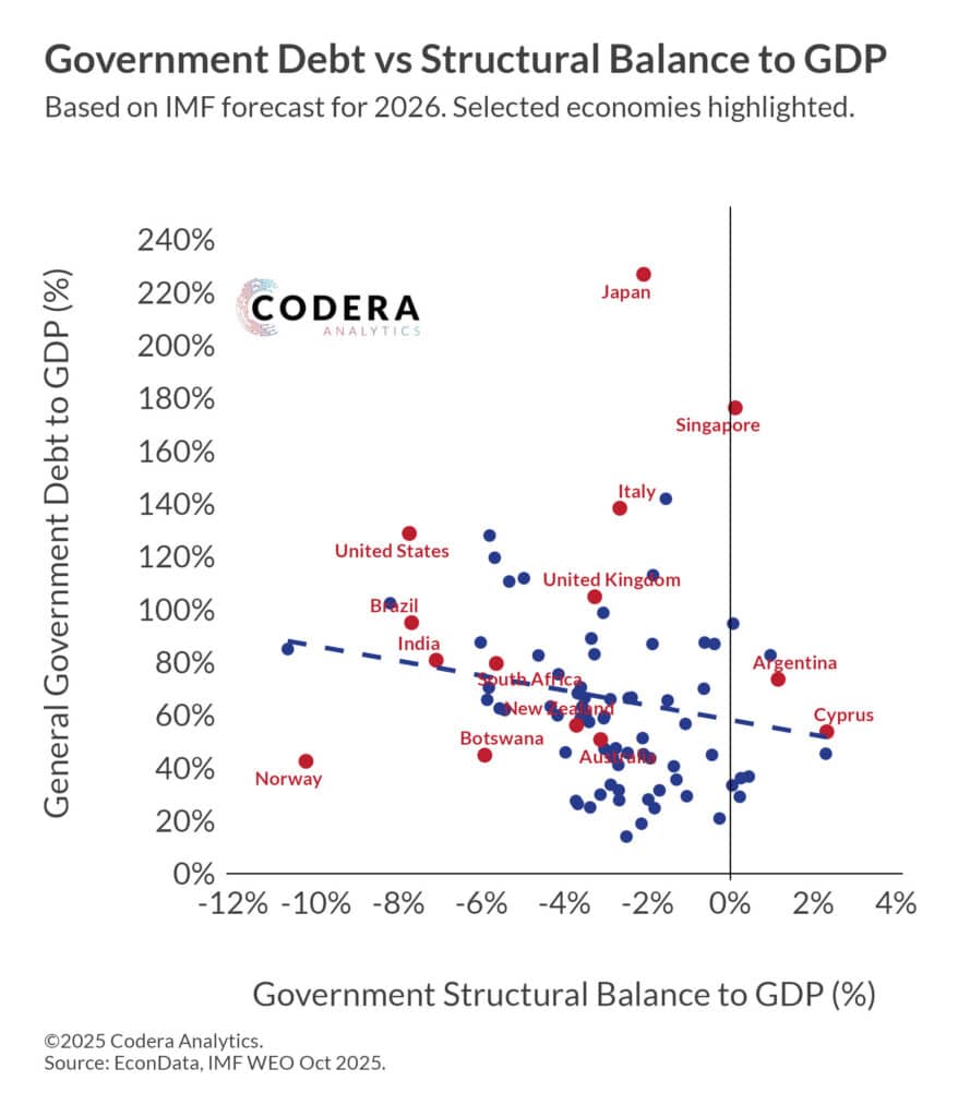Today’s post by Jan Hendrik Pretorius provides a comparison of government debt-to-GDP ratios and IMF estimated structural balances for countries around the world based on their latest estimates. This reveals stark contrasts across major economies, with South Africa, the United States, and China standing out for their unique fiscal profiles. Countries such as the U.S. and China, South Africa carries relatively high debt with one of the most negative structural balances among emerging markets, highlighting significant fiscal strain.