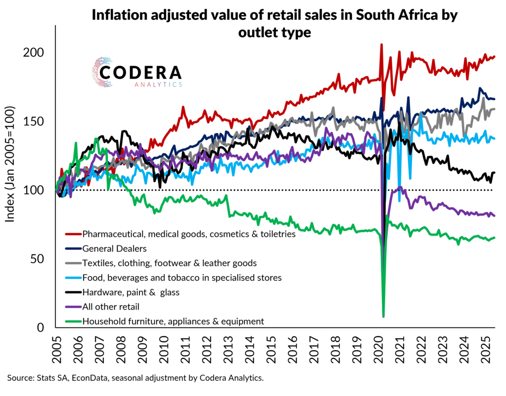 Retail sales of hardware stores and furniture and appliance stores have declined compared to inflation since the pandemic. Unfortunately, official statistics do not provide information on the contribution of the growth of online sales to this.