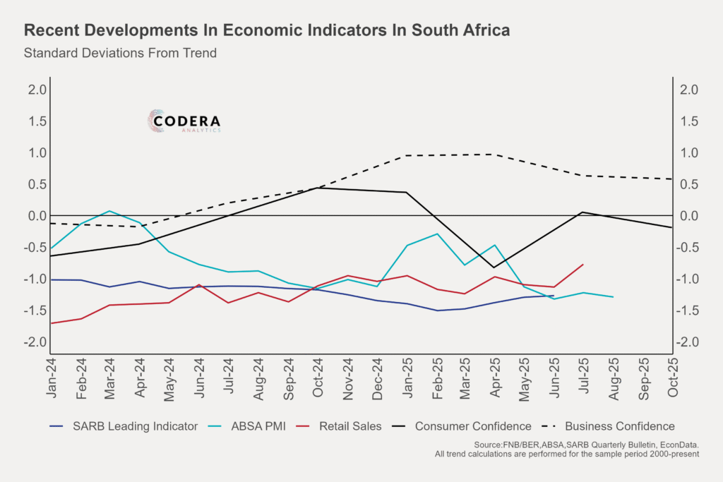 Today’s post by Cynan Cleaver shows that recent economic indicators for SA, measured as standard deviations from their long-term trends, reveal a worrying pattern: most values are currently negative. This suggests broad-based weakness across key areas of the economy and potential downside risks ahead.