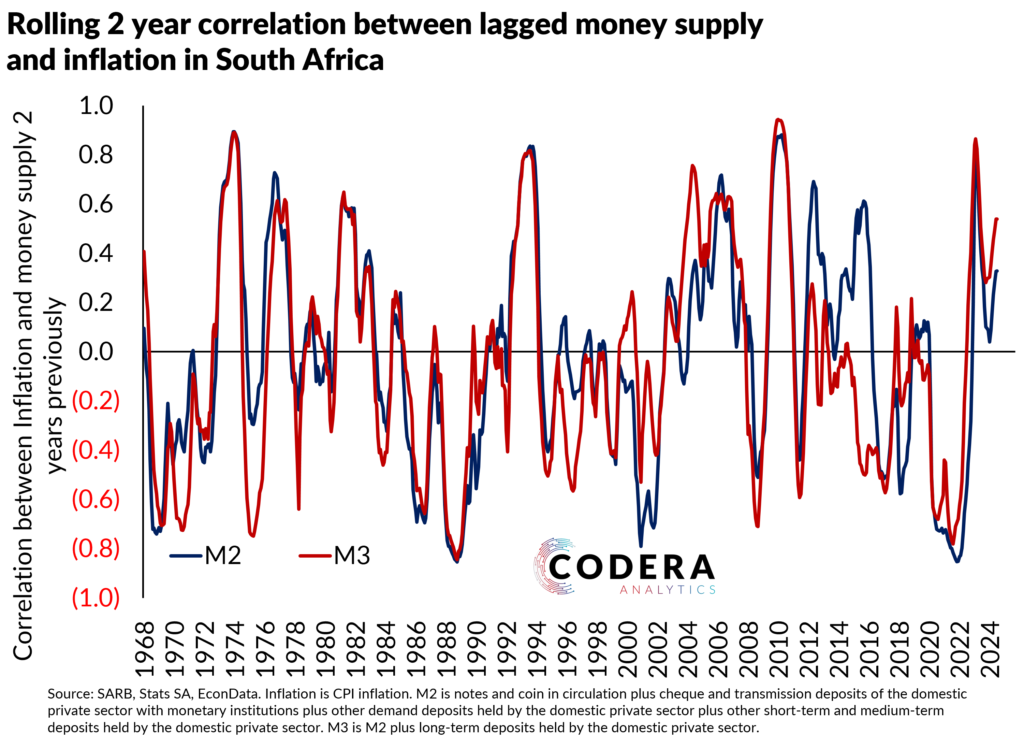 Like many other central banks around the world, the South African Reserve Bank targeted monetary growth (in their case for broad money, ‘M3’) in earlier decades, based on the expectation that inflation was largely a monetary phenomenon. The charts below show that while there was a positive relationship between money supply and inflation in the 1970s, that disappeared after the central bank began targeting money supply growth.