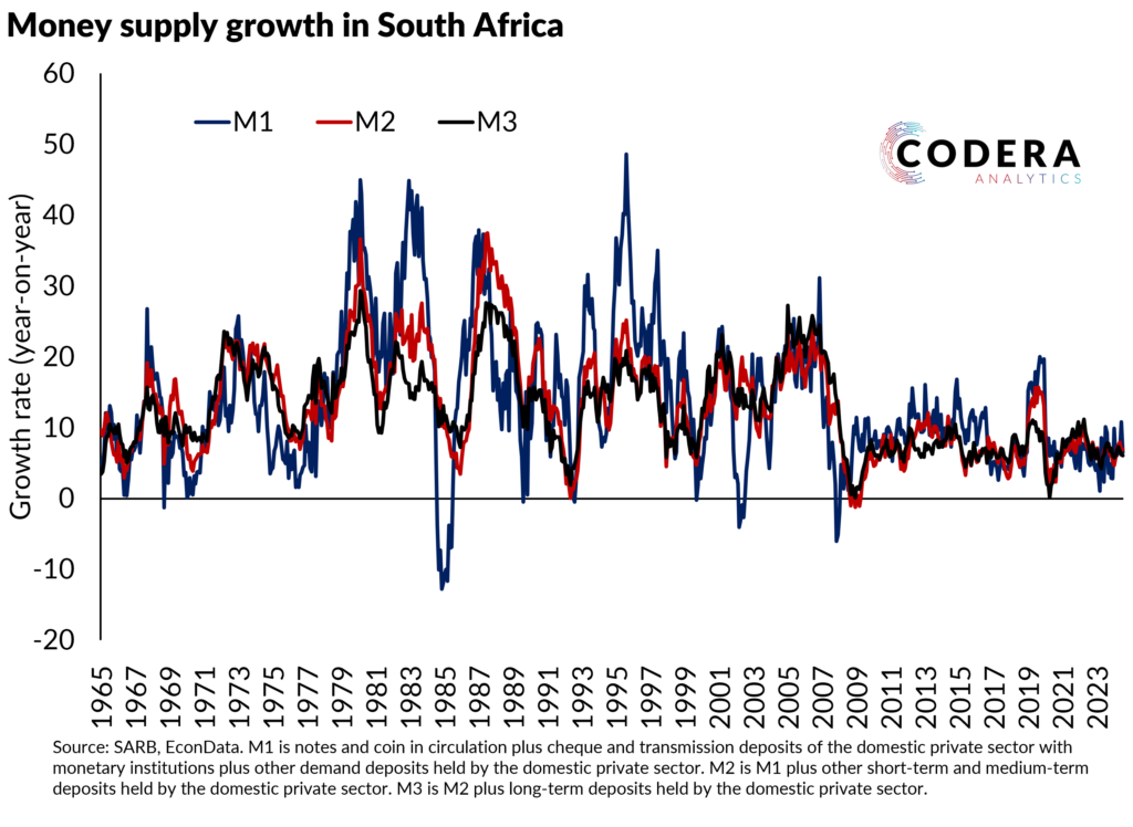 Today’s post updates a previous post looking at the relationship between inflation and money supply. Low interest rates and quantitative easing in major advanced economies led to debate about whether rapid money growth would lead to higher inflation. But in South Africa, money supply growth has recently been much lower than has been the case historically. It is therefore difficult to argue that faster money supply drove inflationary pressure after the pandemic.