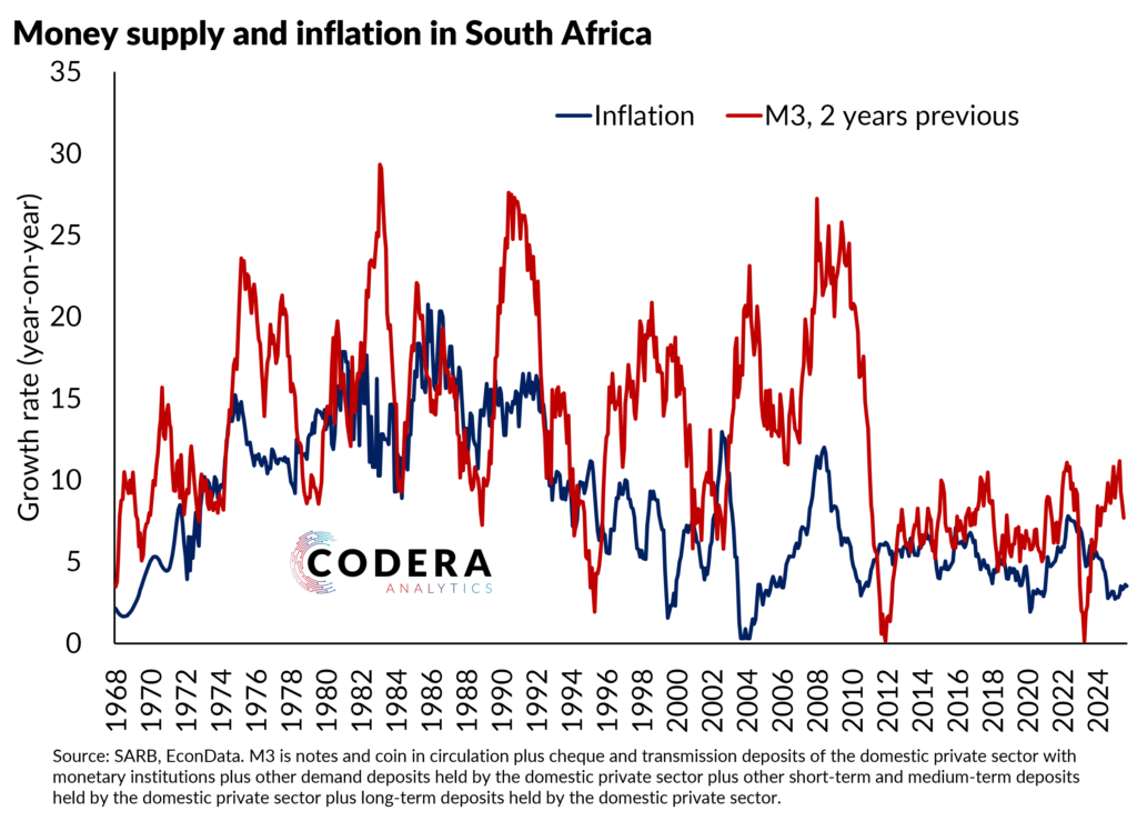 Under an inflation targeting approach to monetary policy, a central bank targets the price of money, not its quantity. As a result, price pressures do not depend directly on money supply, but on real factors (such as demand for credit). In South Africa’s case, credit growth has been anemic for much of the post-global financial crisis period, and there has not been a strong link between money supply and inflation.