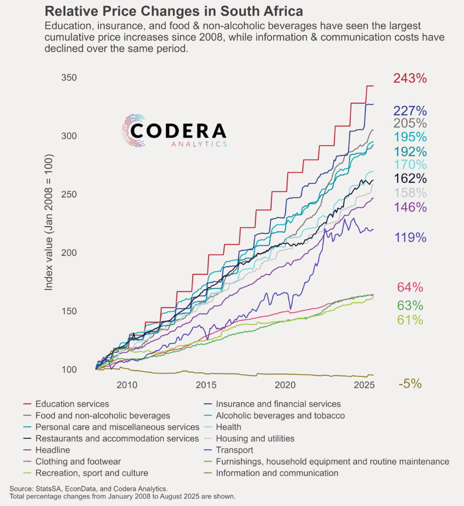 Today’s post by Oliver Guest shows that education, insurance and food and non-alcoholic beverages have seen the largest cumulative price increases since 2008, while information and communication costs have declined over the same period. As we have discussed in earlier posts, the distribution of relative price changes matters for the optimal inflation target, as it affects the tradeoffs the central bank faces in stabilising inflation and output.