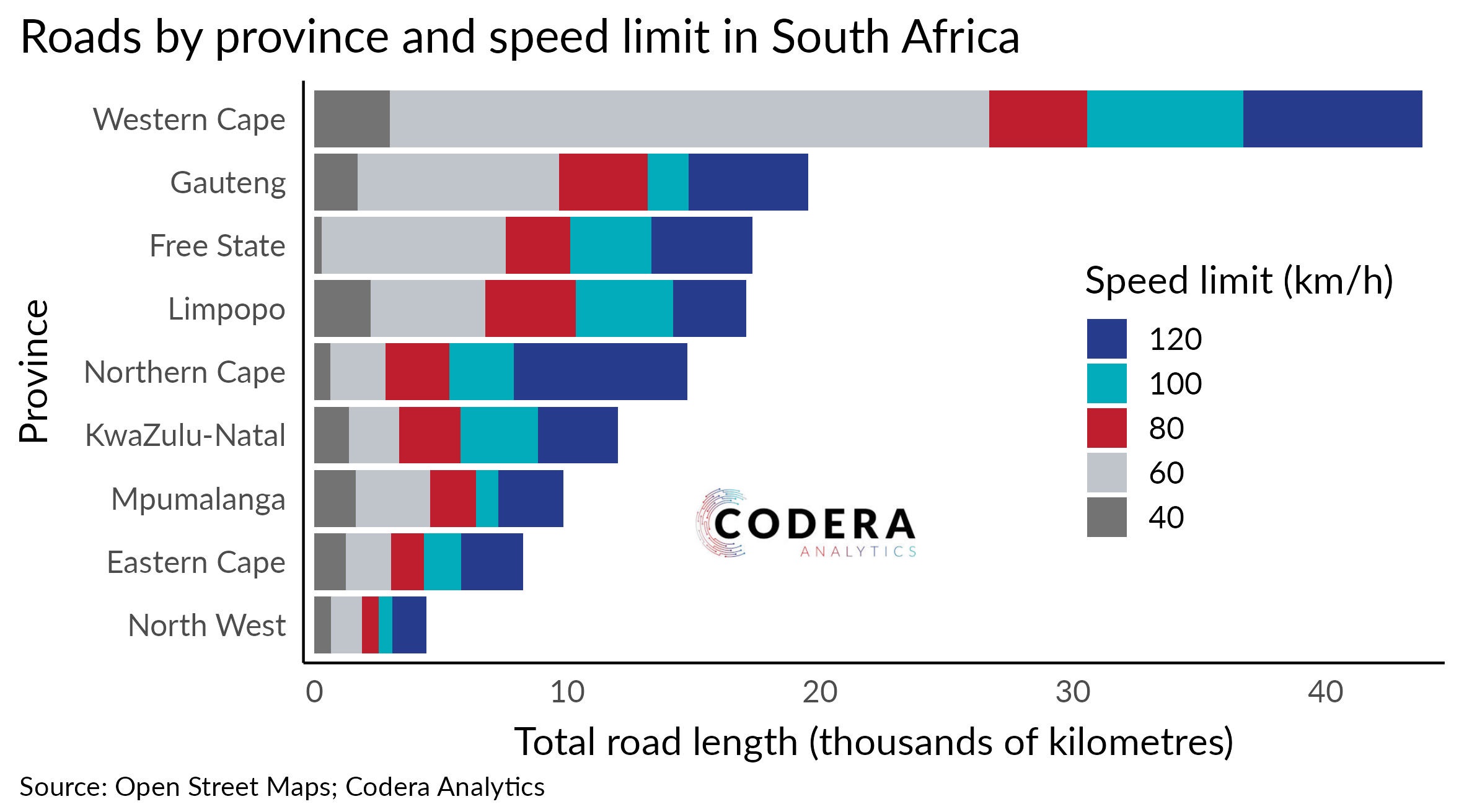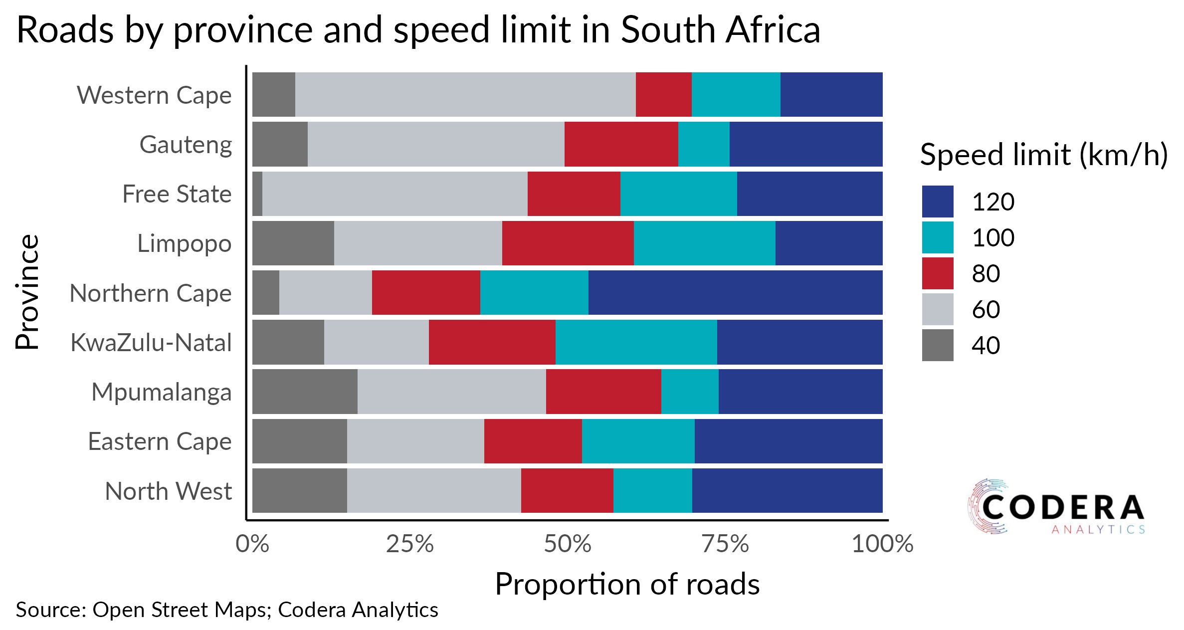 Today’s post by Aidan Horn and Riaan Grobler shows that the Western Cape leads on the total length of roads (much of which is suburban), while the Northern Cape has the highest proportion of 120 km speed limit roads.