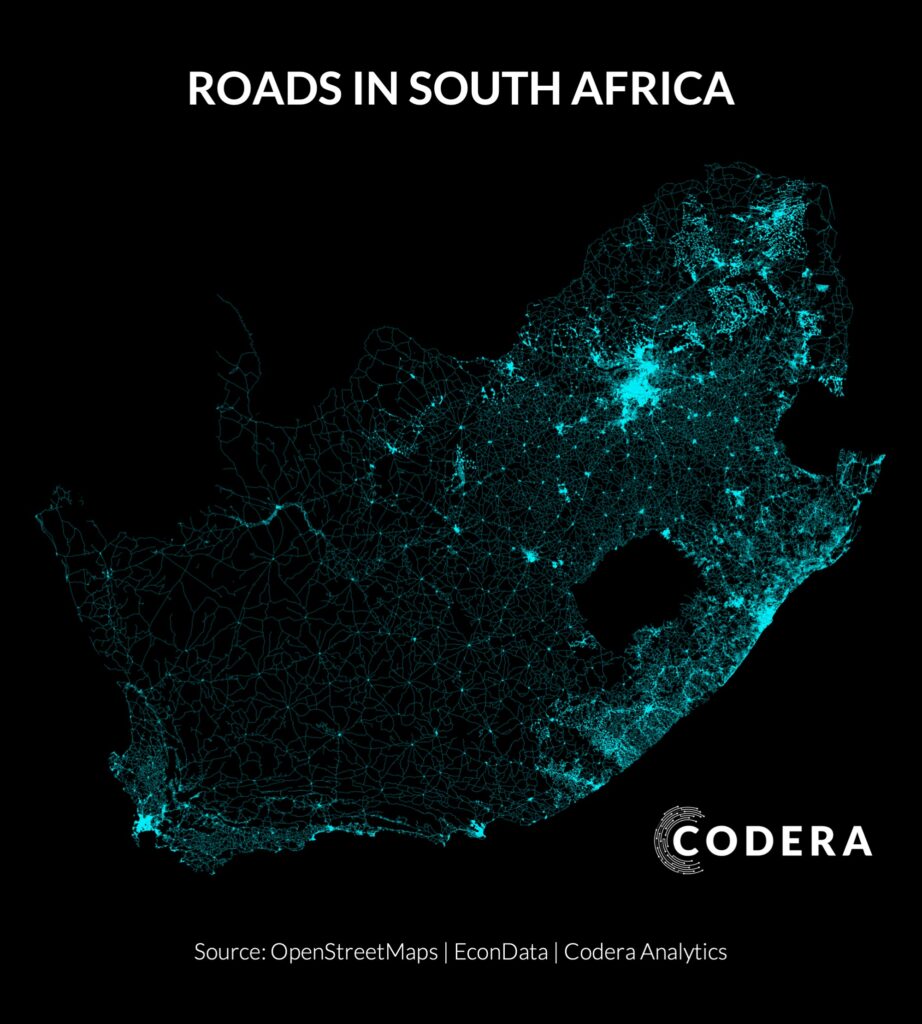 Today’s post by Riaan Grobler shows current road concentration spatially in South Africa. We estimate that there are 147 000 km of roads in South Africa.