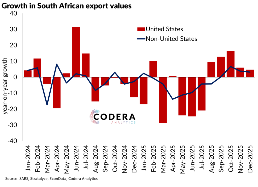 New trade tariffs on South African imports to the US came into effect in August 2025 and we now have data that allows us to asses the impacts on South Africa’s trade. South African exports to the US were actually up 10% in August 2025 compared with a year before. However, it is important to note that rising tensions with the US and policy uncertainty had a big impact on SA’s trade with the US even before the tariffs were implemented. Even though there was some monthly growth in exports, South African exports to the US down were down almost 6% in 2025, while non-US exports were down almost 3% for the year. It is important to note that the figures are not adjusted for inflation.