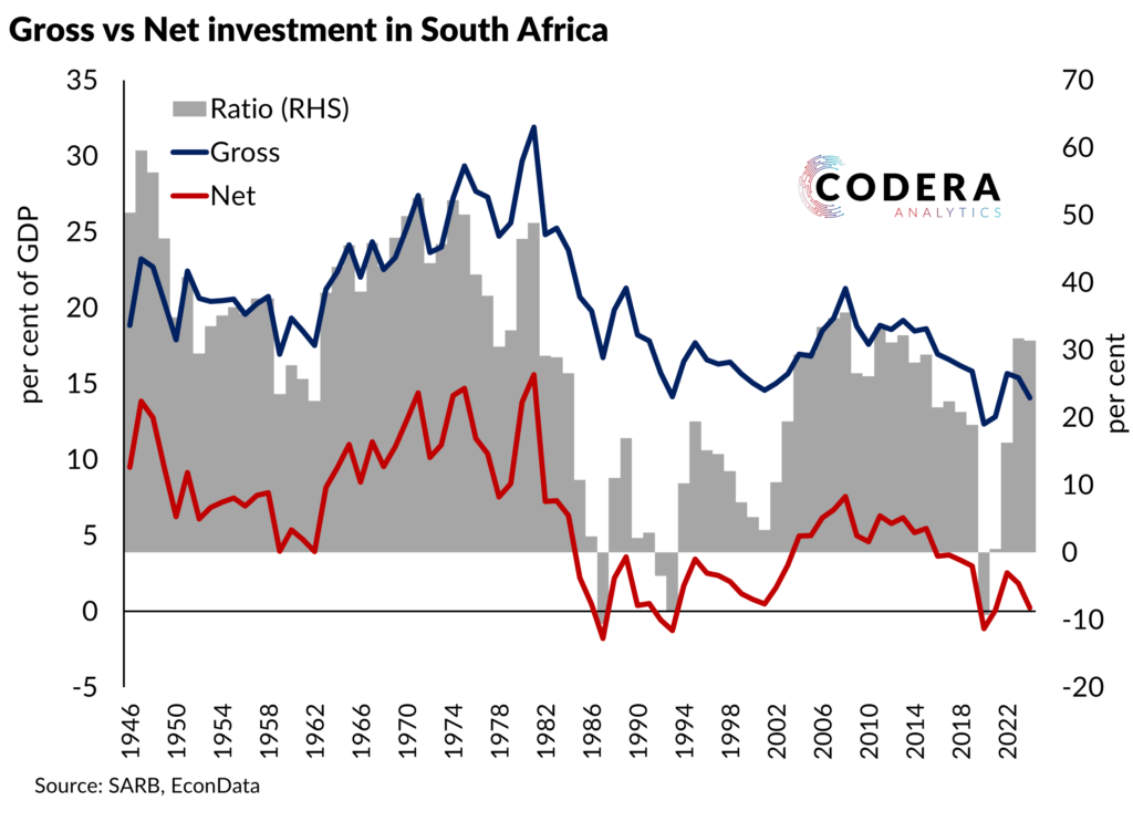 The difference between gross and net investment is depreciation – that portion of investment spent to replace worn out capital. The chart below shows that the gap between gross and net investment has been rising in South Africa. Gross and net investment to GDP have fallen by around 4% each since 2010, relative to their pre-2009 averages. The share of new investment in total investment has also fallen, implying that the share going to replacing old capital has been rising. This growing gap signals the need for more investment to sustain long-term economic growth.
