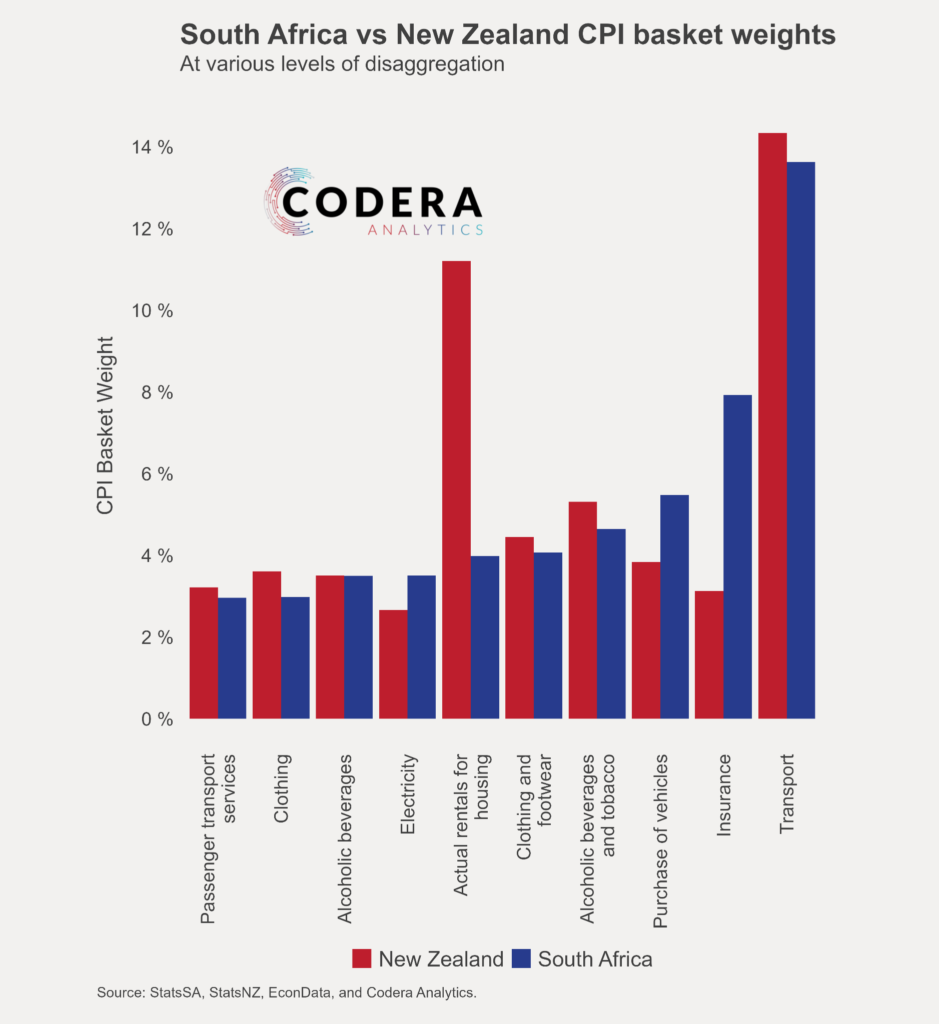 Today’s post by Oliver Guest shows that, for categories that are conceptually aligned (and at the same level of disaggregation), New Zealand has higher weights on housing, but lower on insurance.