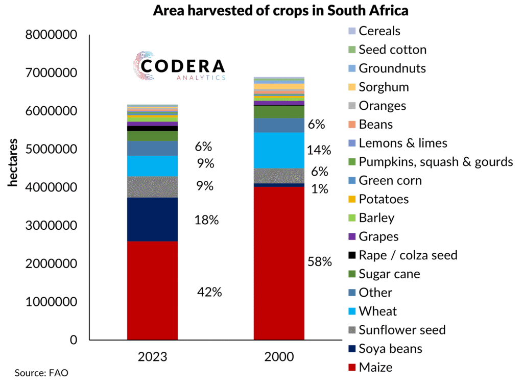 Today’s post shows that the area under commercial agricultural crops has declined over the last 20 years, and that many farmers have shifted from Maize to other crops, particularly soya beans and sunflowers.
