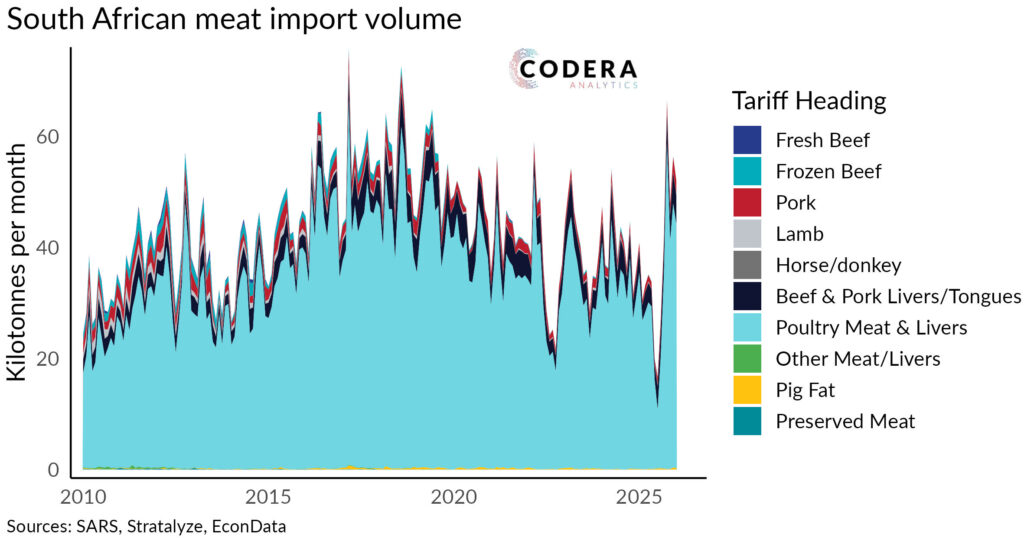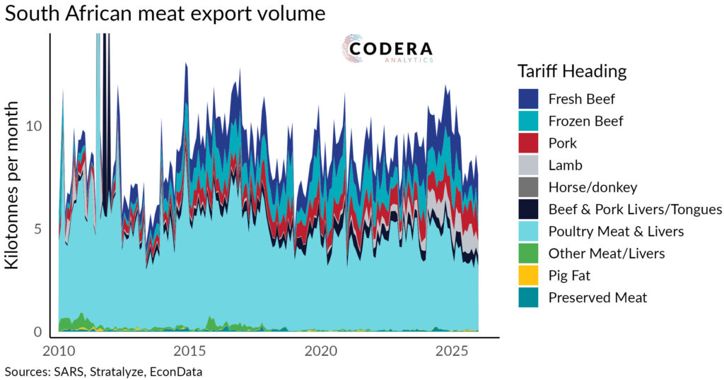 Today’s post by Aidan Horn shows that poultry represents the largest meat import and export category by volume in South Africa. We showed in earlier posts that beef is a larger share of imports and exports by value, and compared South Africa’s trade balance by meat category.