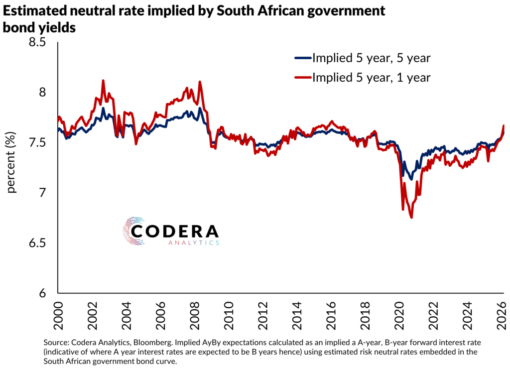 SARB argues that a lower target implies that monetary policy has shifted to a mildly restrictive stance. SARB’s current neutral estimate is 2.8% for 2026 after adjusting for inflation (5.8% nominal assuming a 3% inflation target). This implies tight policy as the current 6.75% policy rate is above that level. We estimate that the market-implied neutral rate is closer to 7.5%.