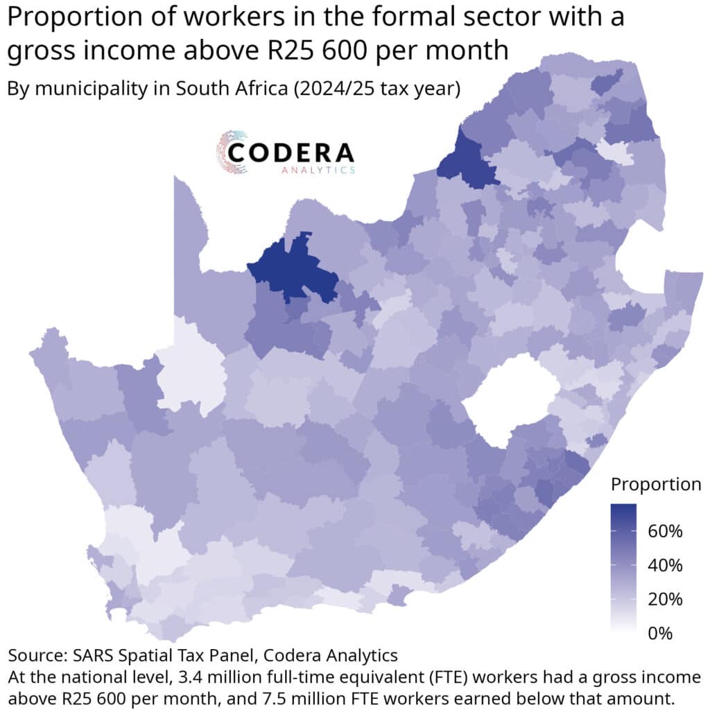 Today’s post by Aidan Horn summarises the proportion of employees in the formal sector earning over R25 600 per month by municipality, based on SARS’ Spatial Tax Panel (available free in easy to use form on EconData).