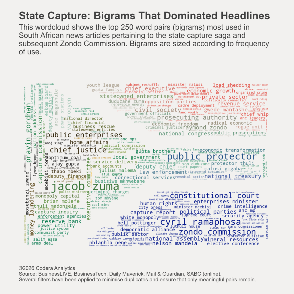 Today’s post by Jacques Quass De Vos summarises the most commonly used word pairs related to state capture in South African news since 2010 (around 30 000 newspaper articles). These phrases give us an eagle eye overview of the key agents and institutions that were implicated in the state capture saga.