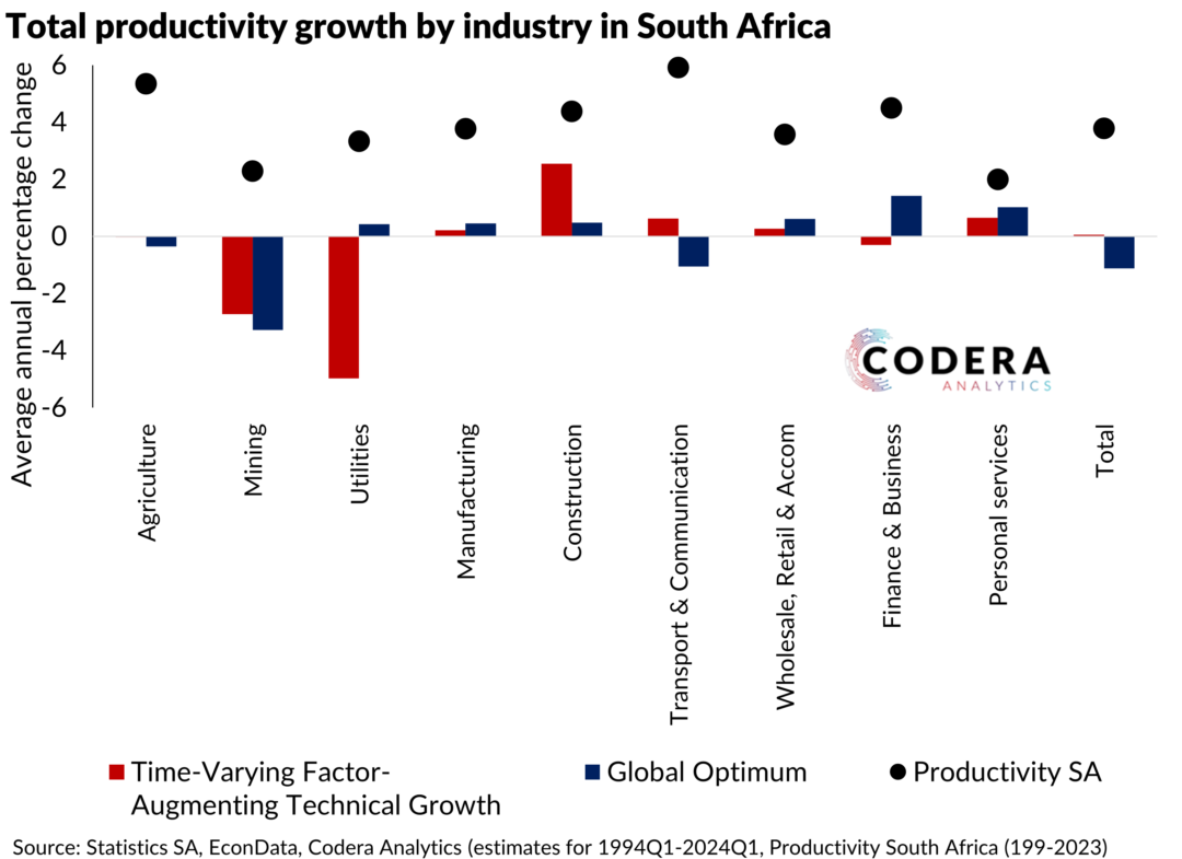 Estimates from the Conference Board imply that the most importance contributor to South Africa GDP growth has been capital deepening, followed by growth in the labour force. According to their estimates, the contribution from the quality of the labour force and total factor productivity has been negligible. This is broadly in line with my constant elasticity of supply production function estimates in this paper. World Bank estimates (based on Cobb-Douglas-based decompositions), on the other hand, suggest a stronger role for total factor productivity in driving growth in South Africa.