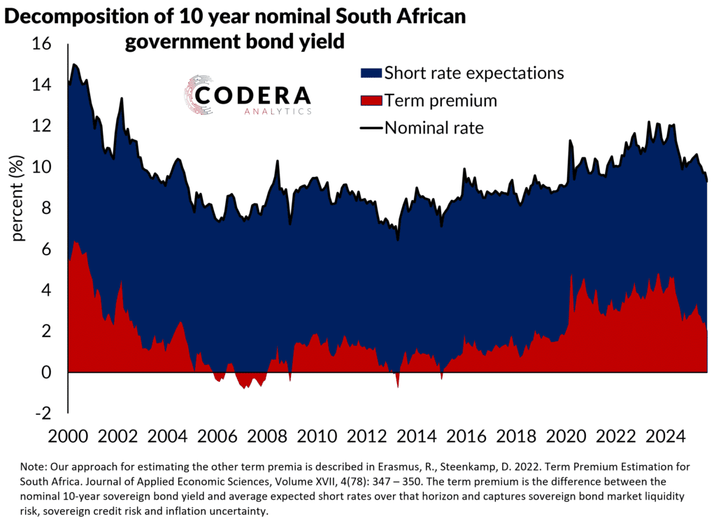 SA bond yields have come down over recent months as the market has priced in lower policy rates here and overseas, and long-term inflation risk and inflation expectations have begun adjusting lower. Our term premium model shows that the decline in long bond yield over 2025 has reflected a fall in average short rate expectations over the long term, as well as the term premium (which captures credit, liquidity and inflation risk premia).